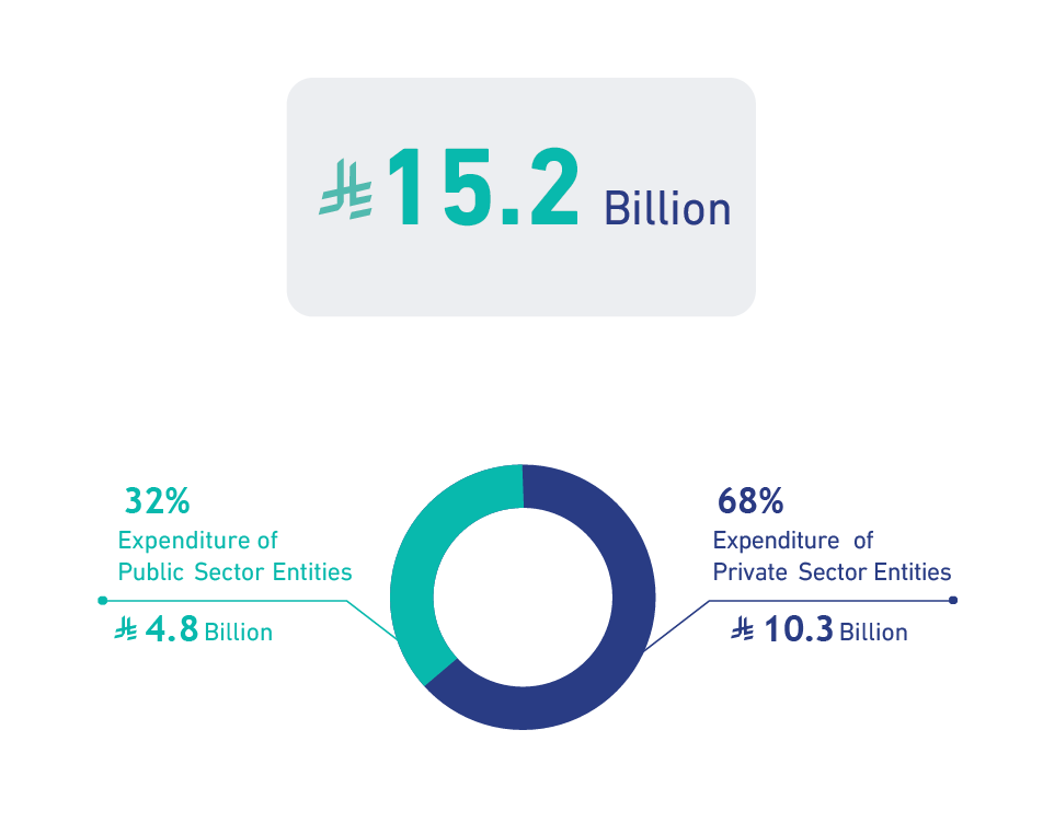 The size of the cybersecurity market in the Kingdom in 2024 reached SAR 15.2 billion, with a growth rate of 14% compared to 2023. This represents the total spending by entities operating in both the public and private sectors in the Kingdom on cybersecurity products, and services. Government entities accounted for 32% of the total spending, amounting to SAR 4.8 billion, while private sector entities spent SAR 10.3 billion, representing 68% of the total expenditure. |