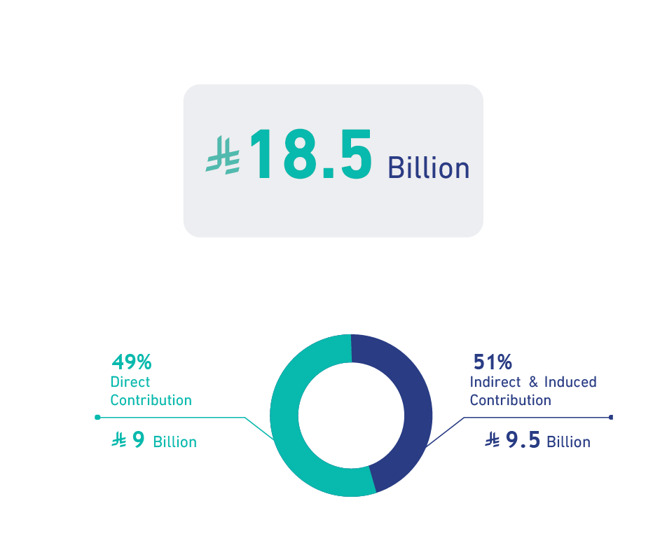 The contribution of the cybersecurity sector to the Kingdom’s GDP at current prices is approximately SAR 18.5 billion. Of this, SAR 9 billion represented direct contributions from cybersecurity product and service providers, while SAR 9.5 billion resulted from indirect contributions. This contribution accounts for 0.40% of the Kingdom’s total GDP and 0.71% of non-oil activities. |